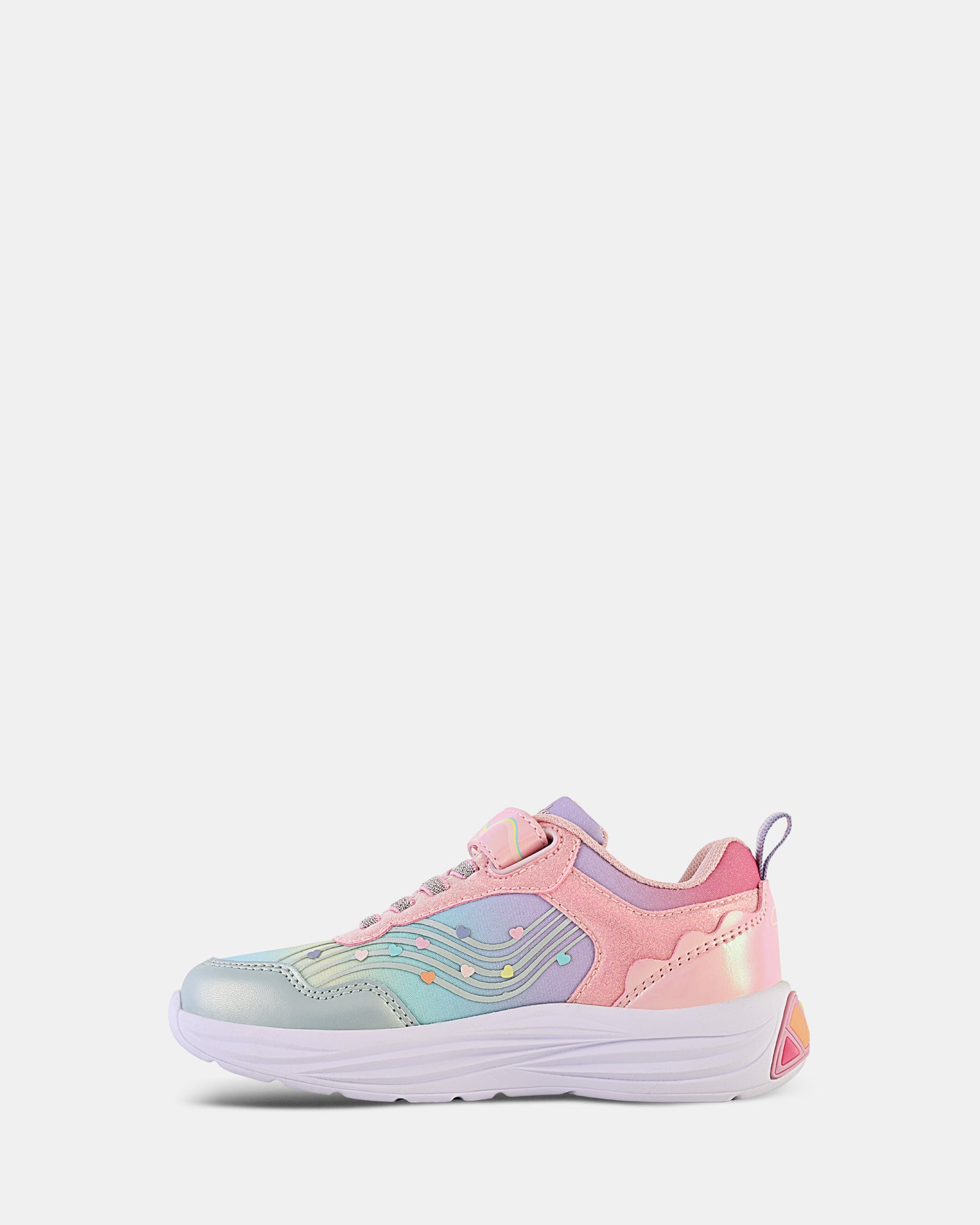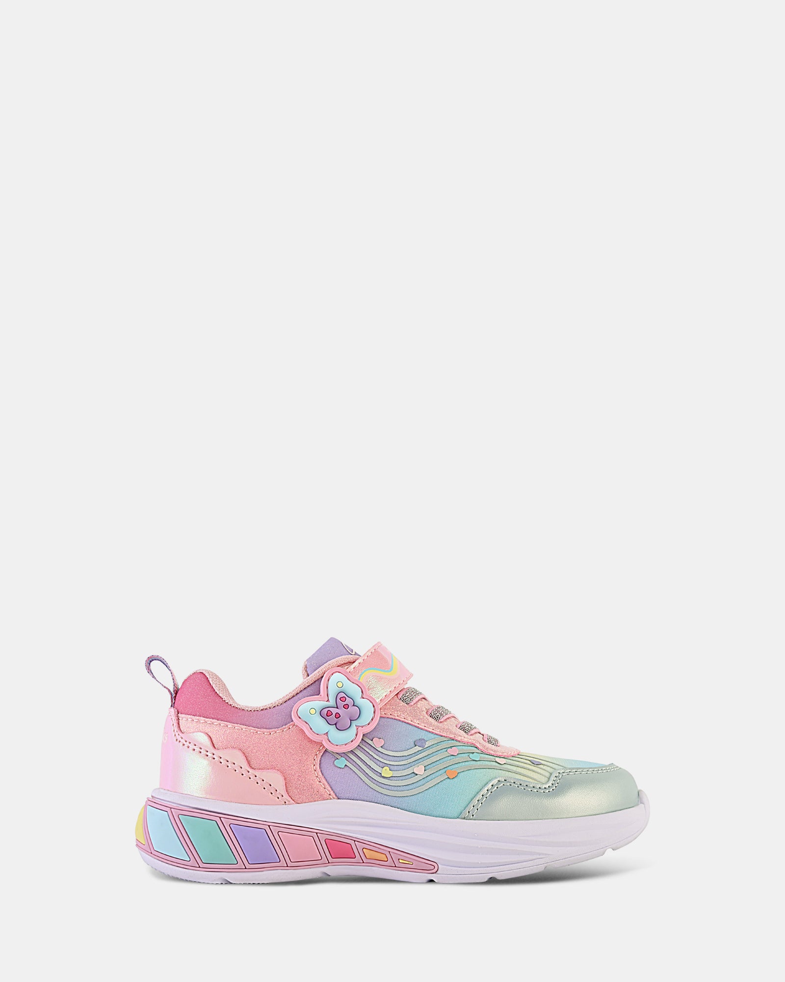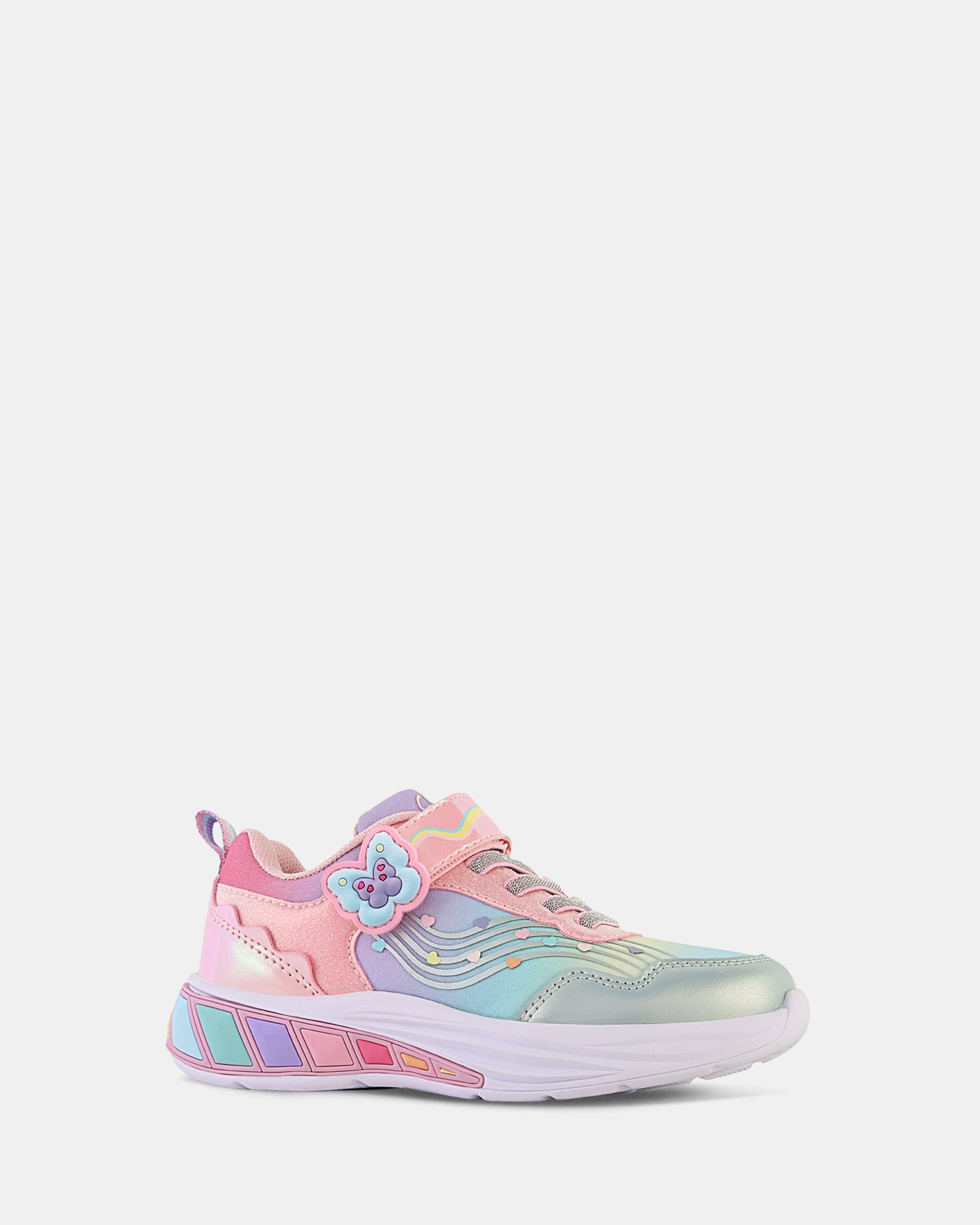 She fluttered and soared through winter. and now Ava returns this summer. magically landing in an ethereal new colour. Featuring her signature butterfly and heart details. Ava adds even more sparkle to every step in a dazzling rainbow hue. With a self-fastening strap and elastic laces for an easy. adjustable fit. reinforced toe caps for durability. and breathable sports mesh material. Ava takes off in the playground with her glowing midsole. The perfect combination of style. comfort. and sparkle!