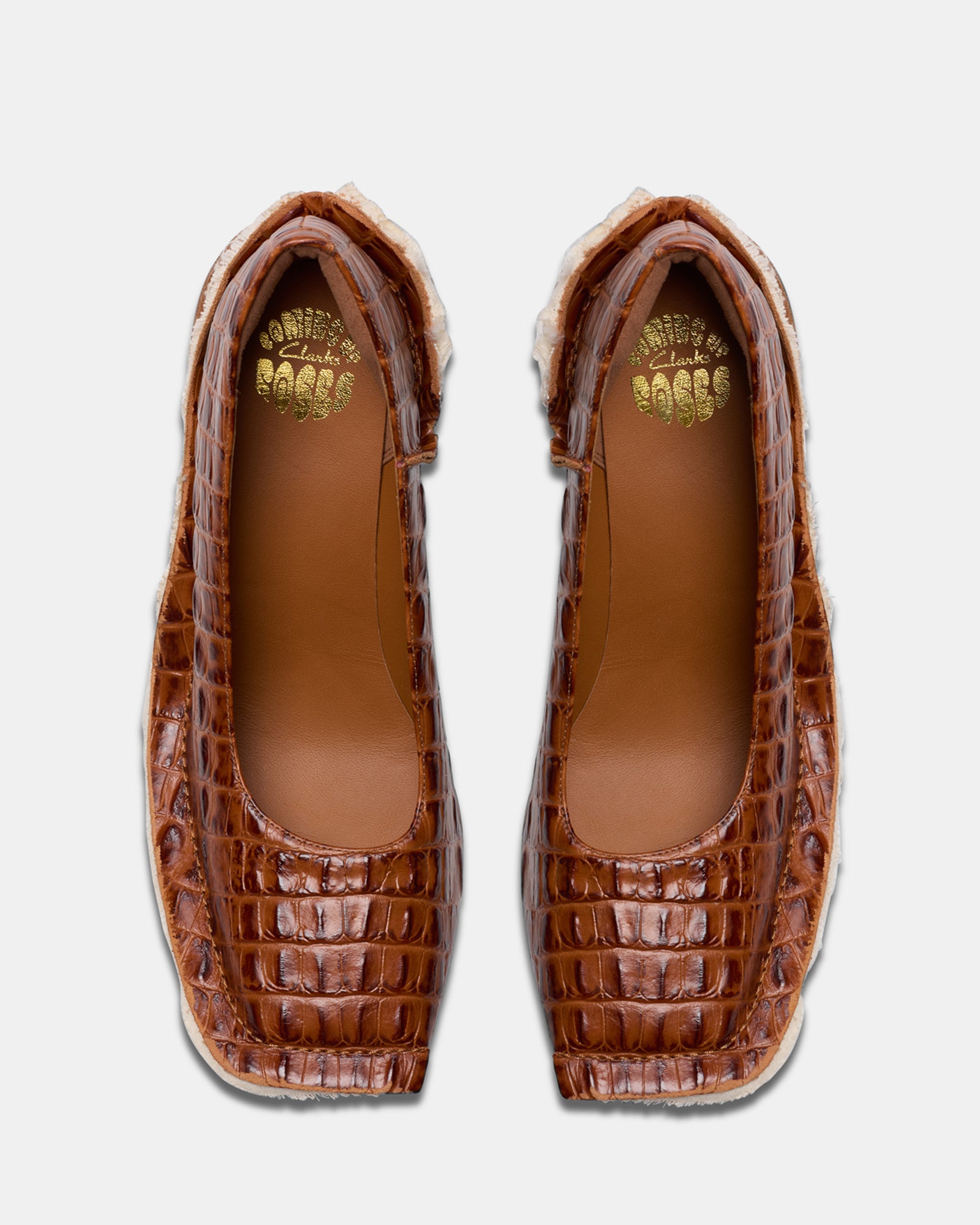 Highlighting our shoemaking expertise. this Martine Rose for Clarks court shoe features a functional. intentionally distressed design which showcases time-tested techniques. Exposed seams reveal the shoe’s multiple inner layers for a utilitarian look. contrasting with tactile croc-embossed pretzel tan leathers. An archival Sachetto construction method and authentic stitching emphasises the commitment to comfort and craft which underpins every pair in the Coming Up Roses collection.