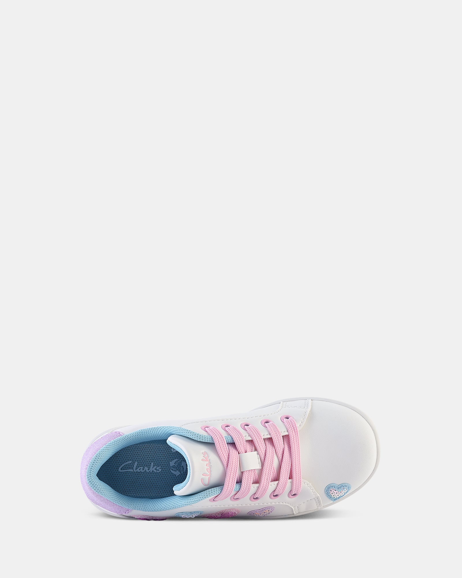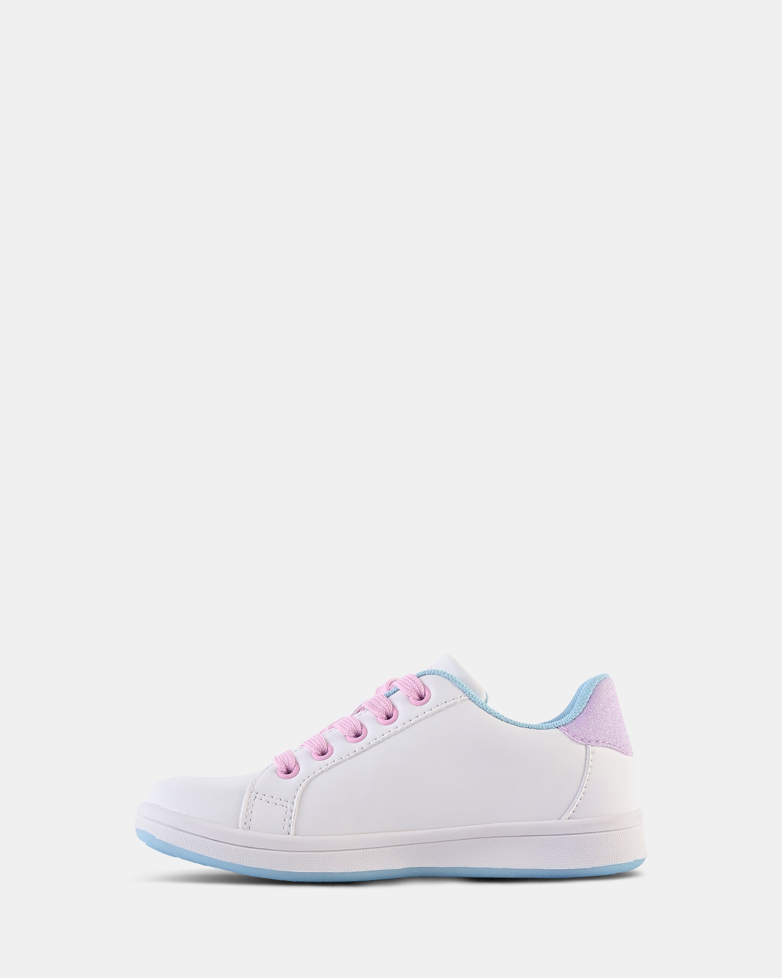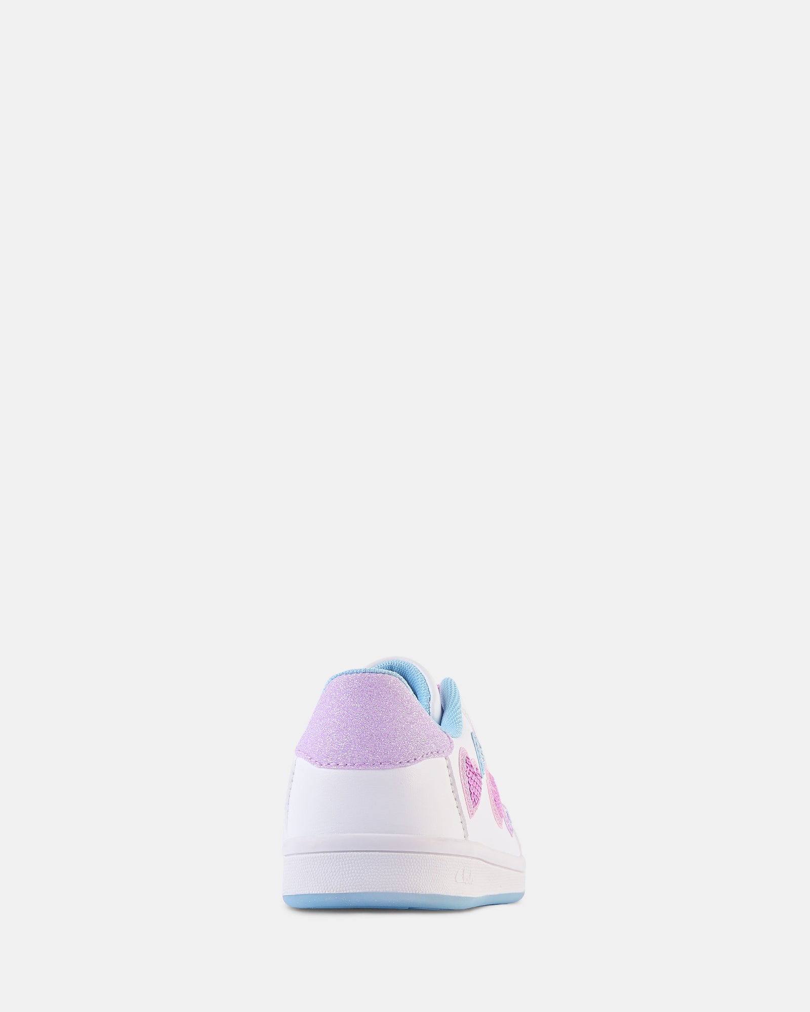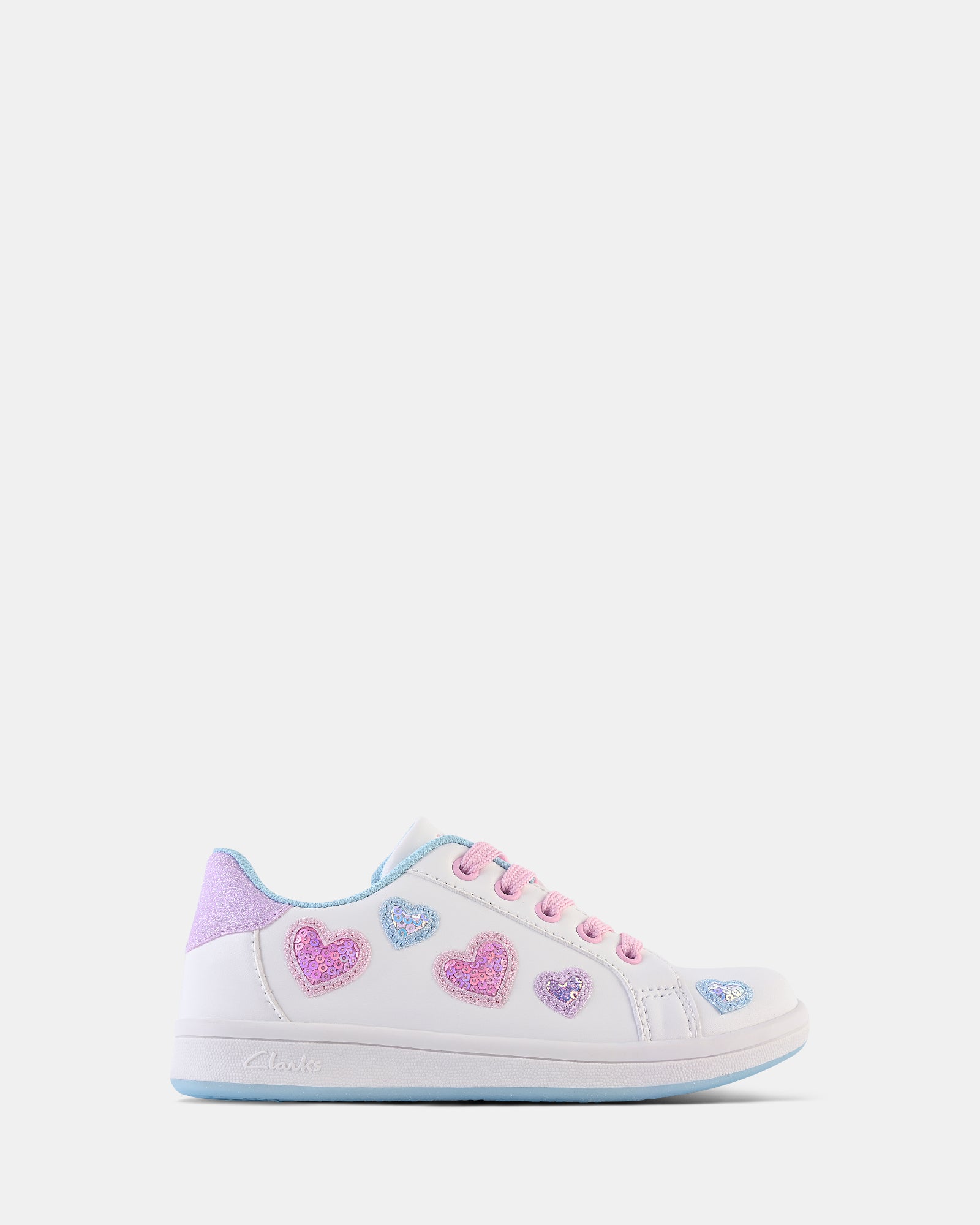 Made for summer adventures. Demy Snr is the newest lace-up sneaker in our range. Featuring side profile sequined hearts. padded collars. and micro-fresh technology. Demy Snr offers a secure fit with a touch of sparkle. Lightweight and breathable. it keeps little feet cool and comfortable. while the flexible sole supports every step.